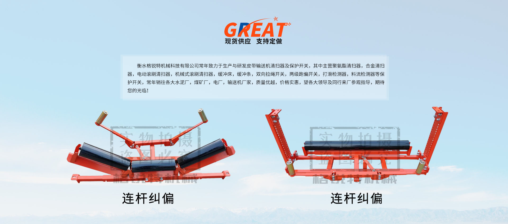 衡水格銳特機(jī)械科技有限公司常年致力于生產(chǎn)與研發(fā)皮帶輸送機(jī)清掃器及保護(hù)開關(guān),其中主營(yíng)聚氨酯清掃器,合金清掃器,電動(dòng)滾刷清掃器,機(jī)械式滾刷清掃器,緩沖床,緩沖條,雙向拉繩開關(guān),兩級(jí)跑偏開關(guān),打滑檢測(cè)器,料流檢測(cè)器等保護(hù)開關(guān),常年銷往各大水泥廠,煤礦廠,電廠,輸送機(jī)廠家,質(zhì)量?jī)?yōu)越,價(jià)格實(shí)惠,望各大領(lǐng)導(dǎo)及同行來(lái)廠參觀指導(dǎo),期待您的光臨!!!